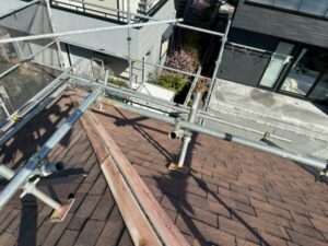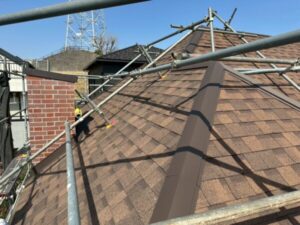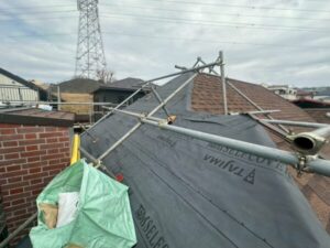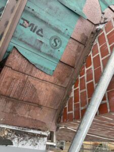 今回の葺き替えでは、既存の屋根材を一旦捲り、下地から谷板金まで新規で造設していきます。
