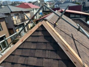 写真は、棟の土台である「貫板」を設置したところです。