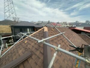 写真は、棟の土台である「貫板」を設置したところです。
